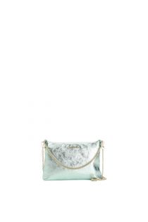Pochette en cuir lamé avec bandoulière en chaîne. fermeture à glissière.
