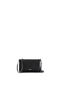Pochette effet lamé en maille et strass. bandoulière avec chaîne en surpiqûre amovible. fermeture par aimant.