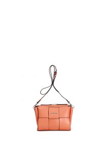 Pochette tressée sans doublure avec des bandes larges une fermeture éclair sur le dessus et bandoulière réglable.