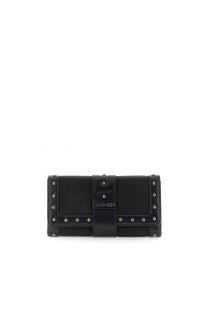 Portefeuille effet cuir avec rabat et boucle ornée de rivets. Compartiment zippé avec inscription métallique.