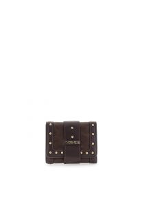 Portefeuille aspect cuir avec rabat et boucle rivetée. Fermeture zippée avec inscription métallique.