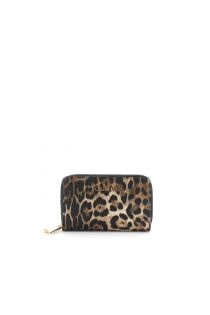 Portefeuille à double fermeture éclair en similicuir imprimé léopard avec inscription, un emplacement pour carte et un autre avec un compartiment zippé pour la monnaie.