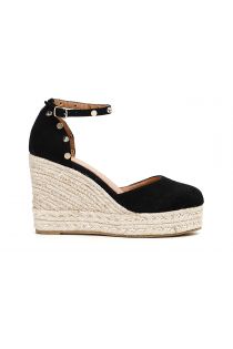 Espadrilles en microfibre avec semelle compensée en corde. Bride à la cheville et fin jeu de cabochons qui orne le talon. Le tressage de la semelle compensée présente deux mouvements différents, ce qui élance encore plus la silhouette.