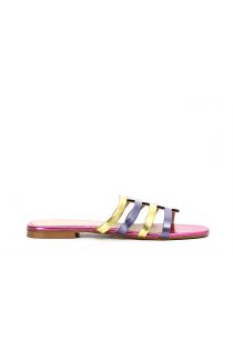 Prix spécial : Sandales plates type mules à lanières laminées dans des nuances de fuchsia.
