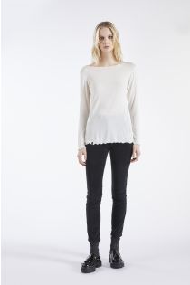T-shirt à col bateau réalisé à partir d’un tissu de soie mélangée. Les coutures sont de couleur contrastante.