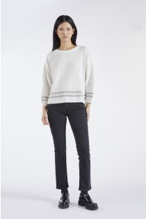 Pull large à col rond, chaud et enveloppant, en fil mélangé angora et lurex. Décorations multicolores dans le bas et aux poignets