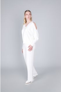 Pull oversize à épaules dénudées et col en V, confectionné dans un fil doux en viscose mélangée. Coupe décontractée et confortable pour un look moderne et polyvalent. Le mannequin mesure 174 cm et porte une taille S.