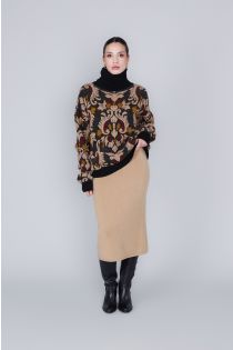 Pull à col roulé en maille jacquard aux chaudes couleurs automnales. Idéal pour des tenues décontractées et confortables-chics. Coupe ample et confortable. Le mannequin mesure 172 cm et porte une taille S.