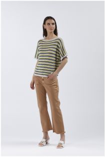 Pull multicolore à encolure bateau et manches courtes. pull en fil de coton mélangé avec un travail de crochet. vêtement de base parfait pour le style années 70. à combiner avec un jean flare ou une maxi jupe.