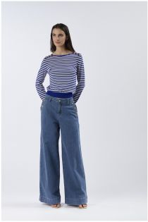 Pull rayé ras du cou avec manches longues et motif de boutons métalliques dorés sur les épaules. tricot en fil de viscose mélangé.