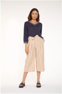 Pull en fil de viscose à la ligne souple avec des détails lurex sur les poignets et le col. Le décolleté ample en V prend le devant de la scène et illumine le modèle.