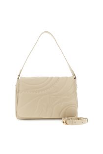 Sac à rabat matelassé et rembourré en similicuir orné de rivets décoratifs. Bandoulière courte et bandoulière amovible avec mousquetons métalliques.