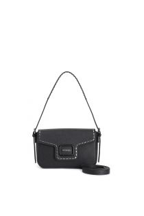 Sac bandoulière en saffiano avec rabat orné d'un accessoire émaillé et de fils métalliques. equipé d'une bandoulière réglable et amovible pour une polyvalence maximale.