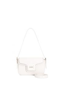 Sac bandoulière en saffiano avec rabat orné d'un accessoire émaillé et de fils métalliques. equipé d'une bandoulière réglable et amovible pour une polyvalence maximale.