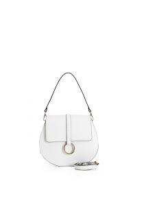 Sac bandoulière rond en cuir lisse avec accessoire. sac à porter à la main ou avec la bandoulière. fermeture à glissière.
