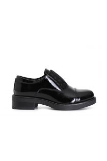 Richelieu pour femme en simili-cuir verni avec élastique central et cabochons. la semelle intérieure est en cuir.