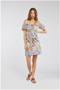 Robe courte à coupe empire et décolleté froncé qui laisse les épaules délicatement découvertes. Trois tissus imprimés exclusifs différents au choix pour tous les goûts.