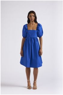 Robe à encolure carrée dont la particularité est un décolleté lacé voyant dans le dos. manches courtes ballon. robe en popeline de coton.