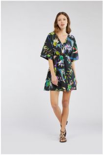 Robe fraîche et confortable, adaptée à différentes morphologies, avec des fronces délicates sous la poitrine, une encolure croisée et des manches kimono 3/4.