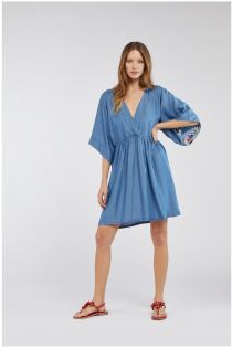 Robe fraîche et confortable, adaptée à différentes morphologies, avec des fronces délicates sous la poitrine, une encolure croisée et des manches kimono 3/4. Le vêtement présente des contrastes de tissu imprimé.