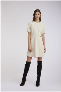 Robe à col ras du cou et à manches courtes avec taille découpée et jupe légèrement évasée. fabriqué dans un tissu bi-stretch confortable.