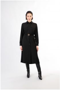 Robe chemise longue en tissu fluide. le vêtement possède des manches longues et des fentes latérales. fermeture avant avec boutons apparents. sa coupe douce ne marque pas la silhouette. la taille est soulignée grâce à la ceinture en tissu avec boucle logo cafènoir.