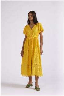 Robe chemisier délicate en tissu sangallo. manches courtes et ballon taille à coulisse. robe de style romantique et féminin.