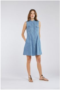 Robe chemisier sans manches et évasée en toile chambray avec passementerie appliquée sur les poches et un jeu sinueux de godets dans le bas créant l'évasement et l'amplitude du vêtement.
