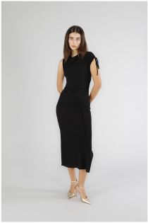 Robe sans manches en tissu superstretch avec cordon de serrage sur l'épaule et drapé sur le côté. longueur en dessous du genou avec fente latérale sur un côté. robe parfaite avec des chaussures à talons hauts pour une soirée romantique et élégante.