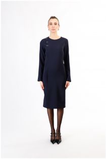 Robe fourreau à col rond et motif faux portefeuille avec finitions personnalisées. le vêtement a des manches longues et est confectionné en tissu bi-stretch. fermeture zippée dissimulée à l'arrière. robe simple et polyvalente parfaite pour le bureau féminine et en même temps pratique à toujours garder dans votre garde-robe.