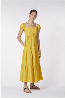 Robe longue à volants avec boutonnage sur le devant et épaules nues