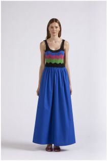 Robe longue sans manches. le haut est tricoté avec un fil de coton mélangé multicolore crocheté. la jupe est en popeline de coton.