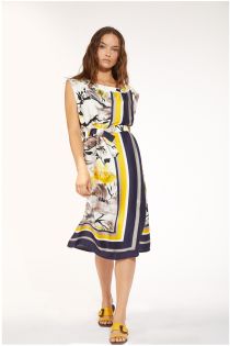 Robe élégante au modèle faux portefeuille en satin de viscose imprimé à rayures et à fleurs. Éléments contrastants de couleur unie pour la bordure du col