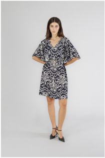 Robe longueur genou avec décolleté en "v" et ceinture avec logo à la taille. manches larges. réalisé en viscose marocaine avec imprimé exclusif. robe recommandée pour les occasions toute la journée et également parfaite pour les looks de bureau.