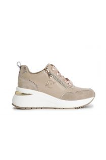 Chaussures de course pour femmes en cuir enduit avec empiècements en daim et fermeture éclair décorative sur le côté. assise plantaire interne.