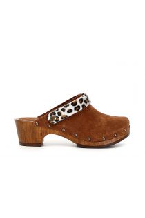 Sabots en daim avec insert en poulain tacheté, semelle compensée sur talon moyen.