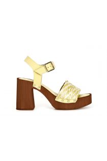 Sabots avec talon en bois et bande décorative en raphia tressé bicolore.