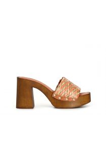 sabots avec talon en bois et bande décorative en raphia tressé bicolore multi orange
