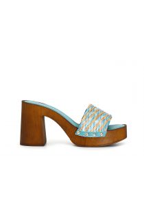 sabots avec talon en bois et bande décorative en raphia tressé bicolore multi turquoise