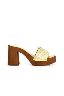Sabots avec talon en bois et bande décorative en raphia tressé bicolore.
