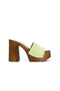 Sabots avec bande en croûte de cuir disponible en 6 couleurs. plateforme et talon en bois foncé et semelle intérieure en daim assortie à la couleur de la bande.