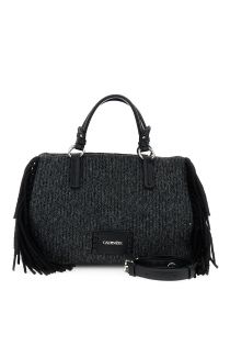 Sac à main en maille effet laine avec franges latérales, double anse et bandoulière ajustable. Détails en similicuir, étiquette logo sur le devant et boutons décoratifs sur les côtés.
