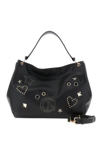 Sac bandoulière en similicuir orné de rivets et du logo Café Noir perforé. Bandoulière amovible pour un style audacieux et polyvalent.