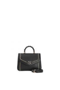 Sac à main avec application de chaîne en métal doré et logo cafènoir. manche en métal avec tube. fermeture magnétique. bandoulière amovible.