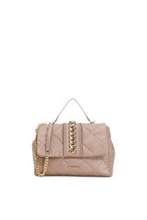 Sac à main modèle porte-documents avec rabat matelassé, muni de poignée et bandoulière en option. Bande centrale avec fils apparents sur les bords et grande chaîne métallique au centre.