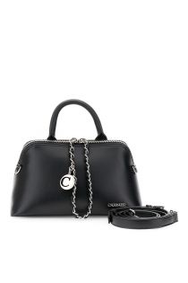 Sac à main trapézoïdal en similicuir avec fermeture éclair apparente, chaînette décorative et breloque en métal. Bandoulière ajustable et amovible.