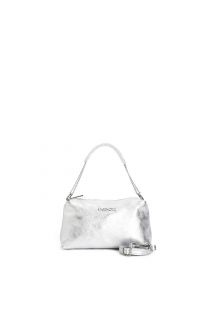 sac appareil photo en cuir métallisé avec anse en chaîne avec poignée et pompon silver