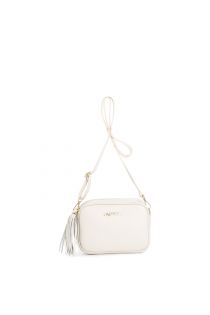 sac appareil photo en cuir texturé avec bandoulière avec mousquetons et pompon beige