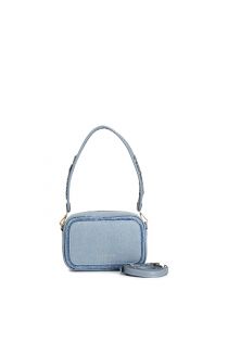 Sac pour appareil photo en denim effiloché avec fleurs en pierre et strass. fermeture à glissière. double bandoulière