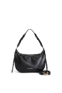 Sac souple avec poches latérales tirette de zip bicolore ornée de rivets fermeture zippée poignée tressée logo sur patch métallique et bandoulière amovible.